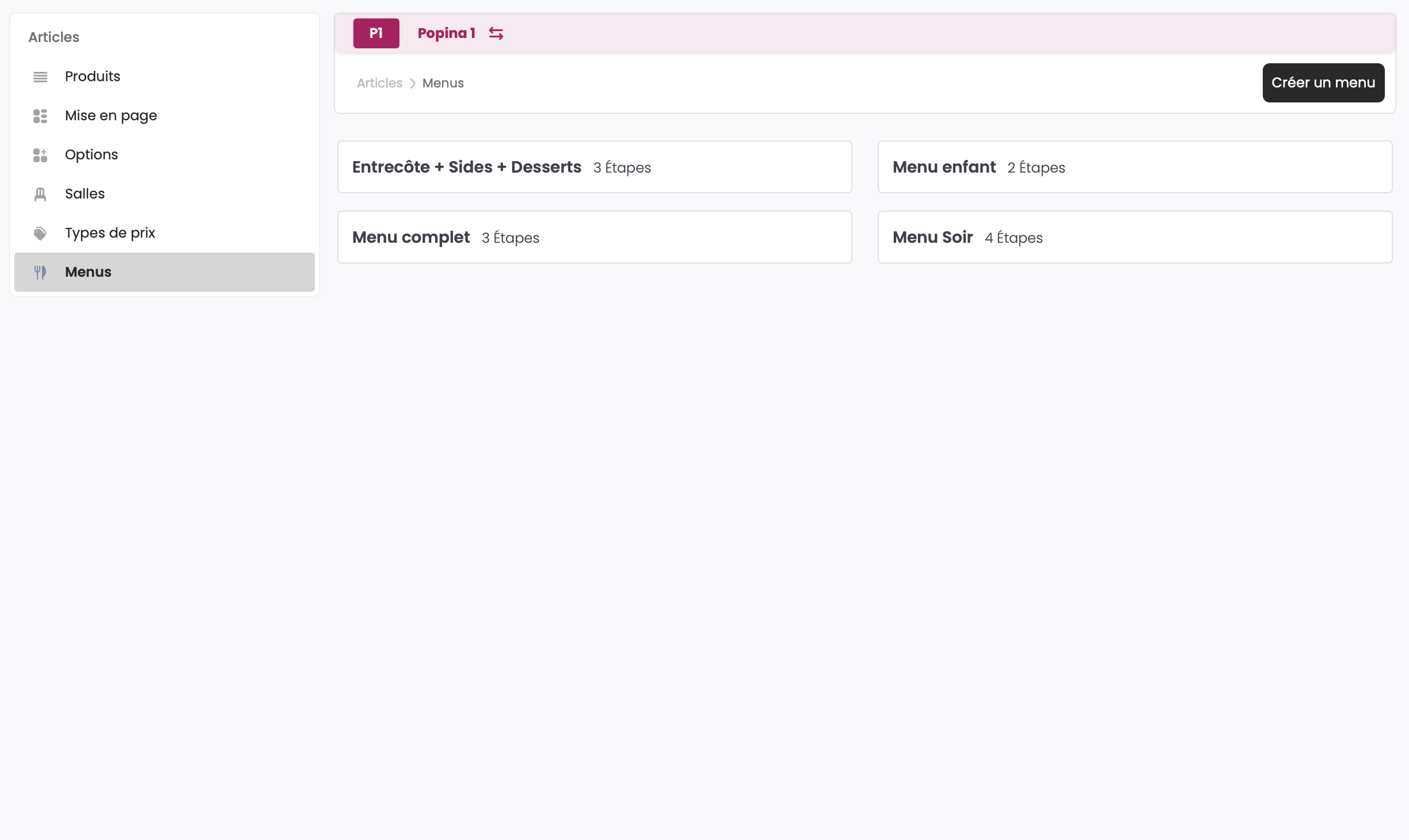 Les menus sont une accumulation d'articles déjà existants dans votre caisse afin de former un menu avec son propre prix.