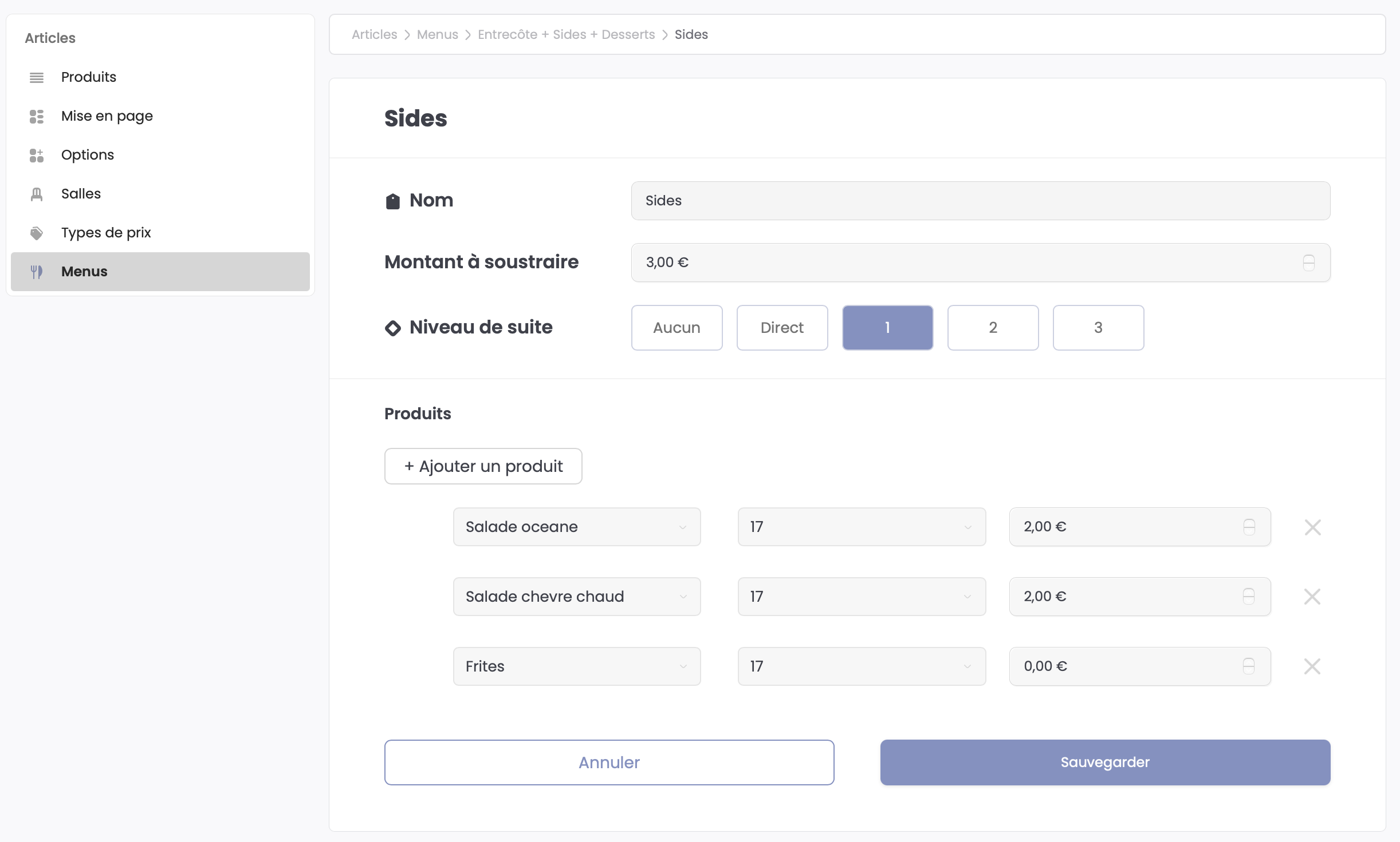 Dans un menu, le niveau de suite de l'étape est prioritaire sur le niveau de suite du produit sélectionné.