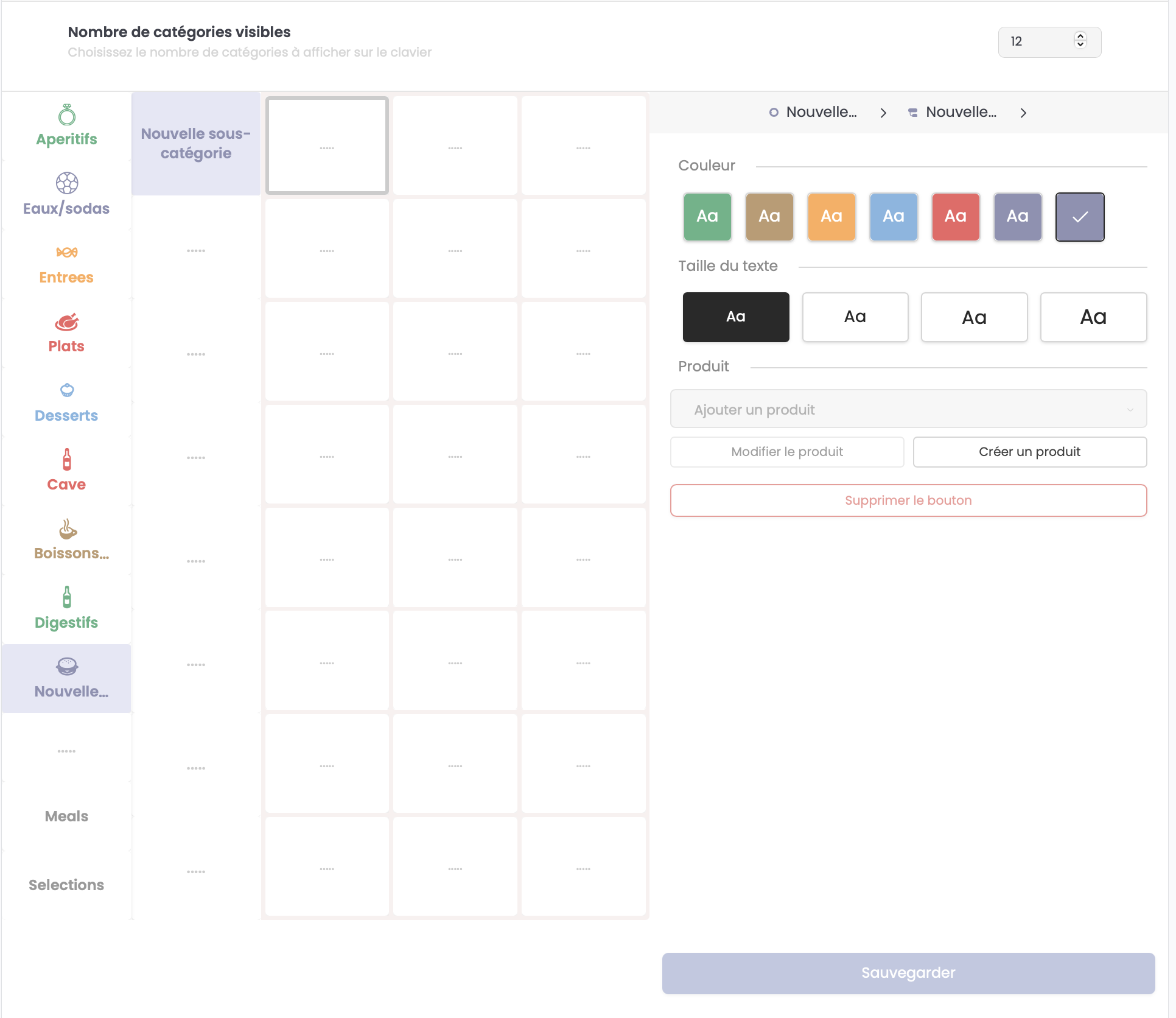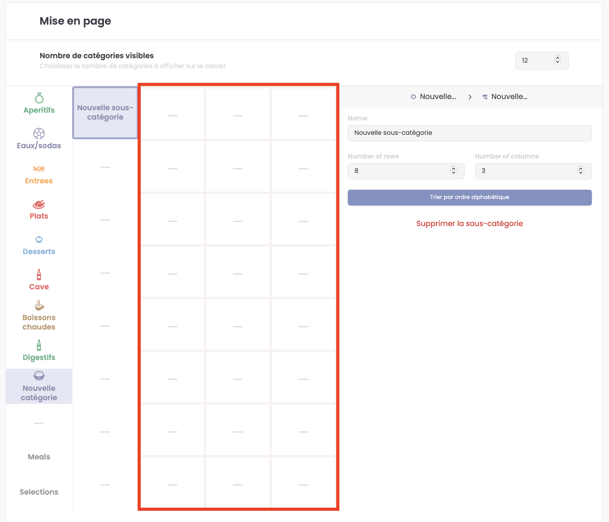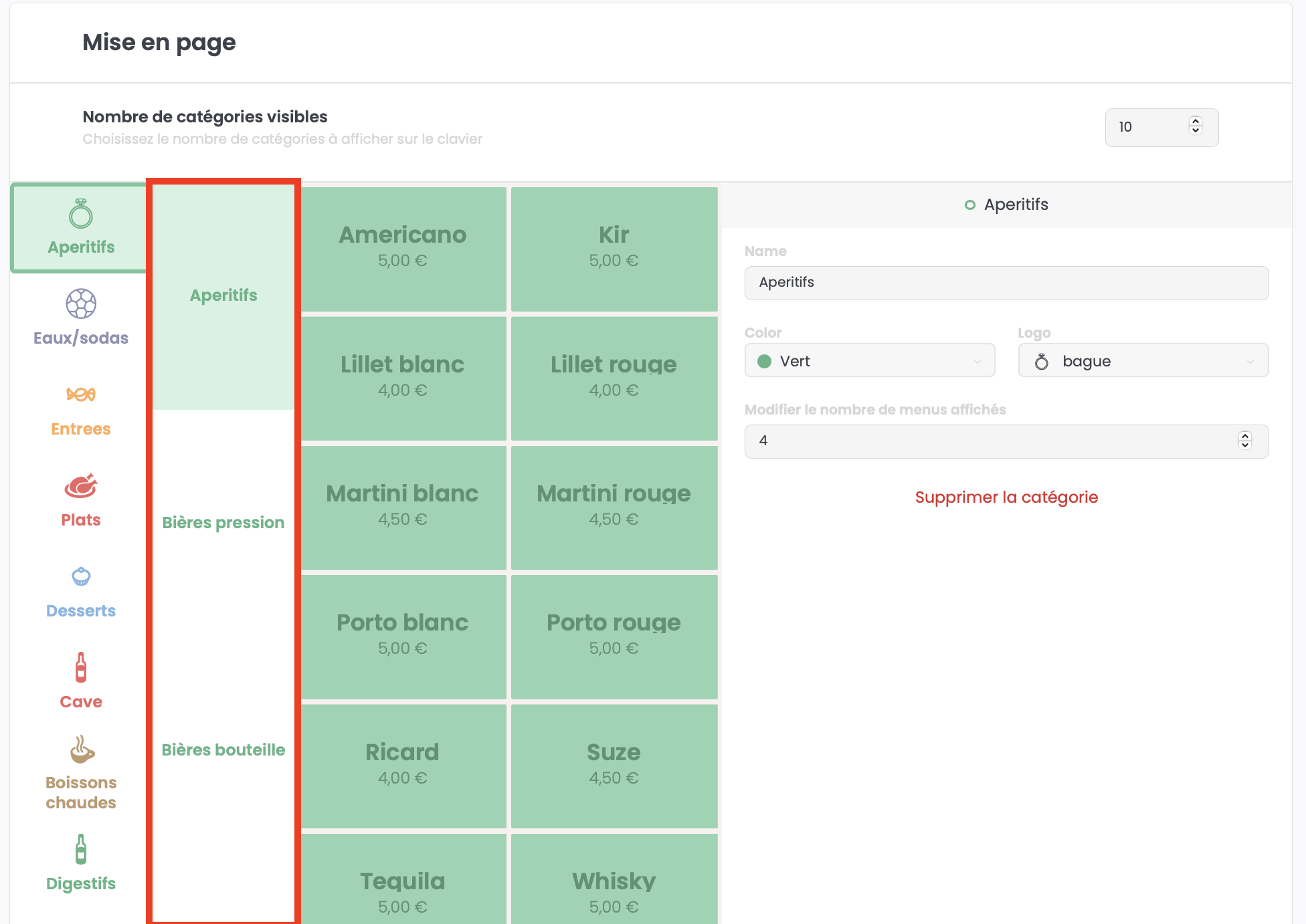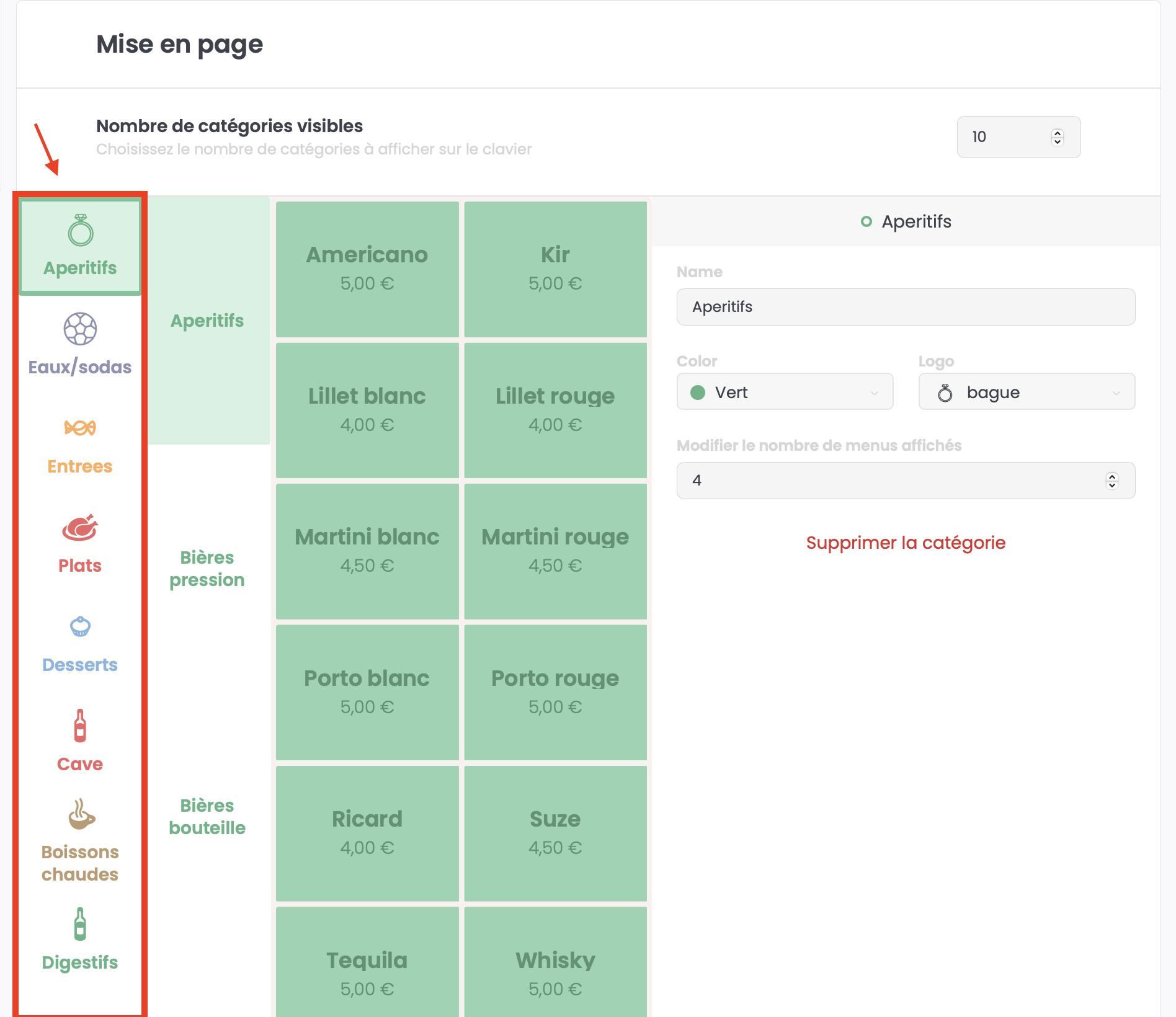 Vous pouvez définir le nombre de touches catégories que vous souhaitez afficher sur votre mise en page allant d'un minimum de 4 catégories jusqu'à 16 maximum.