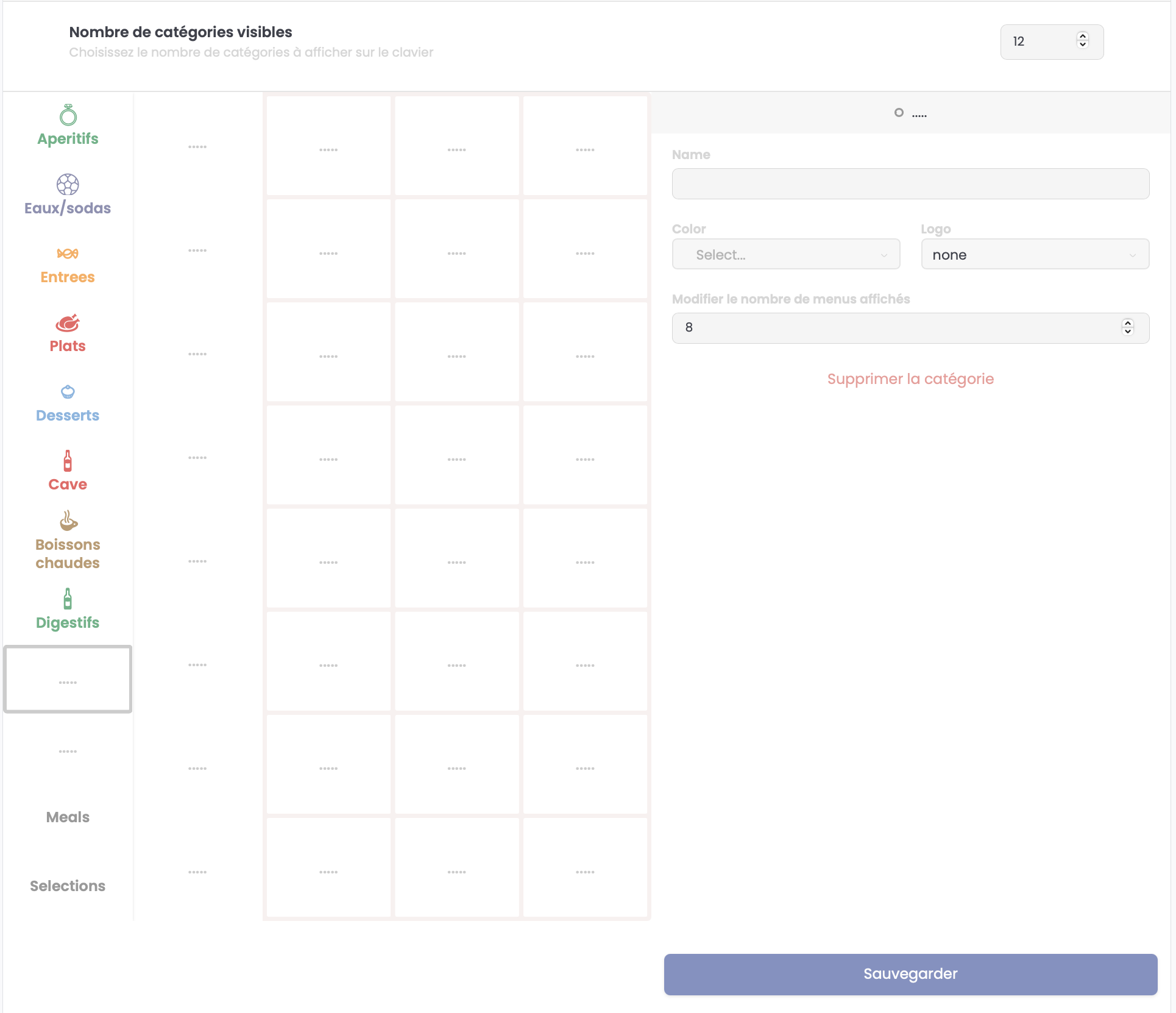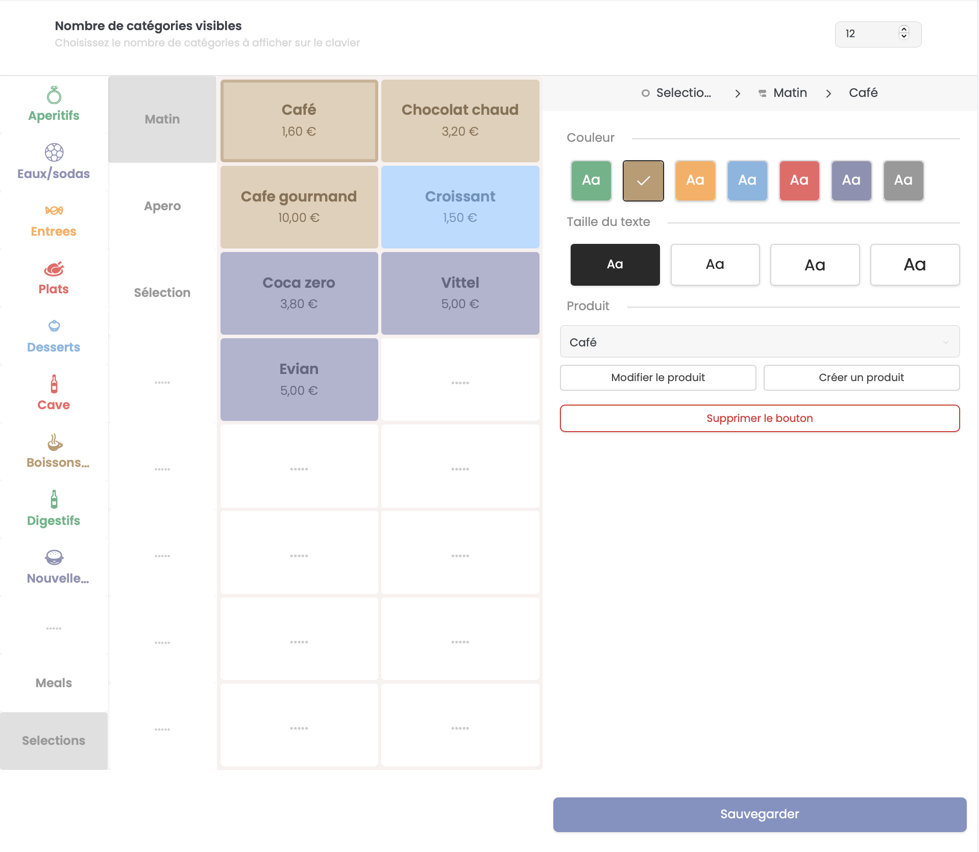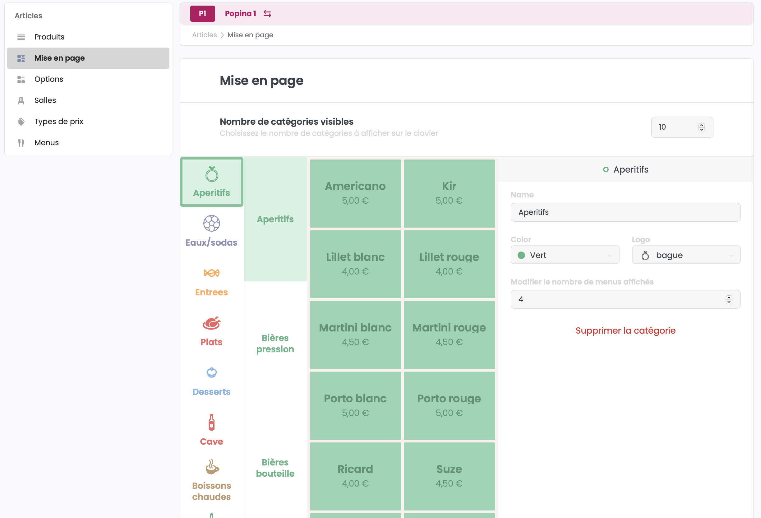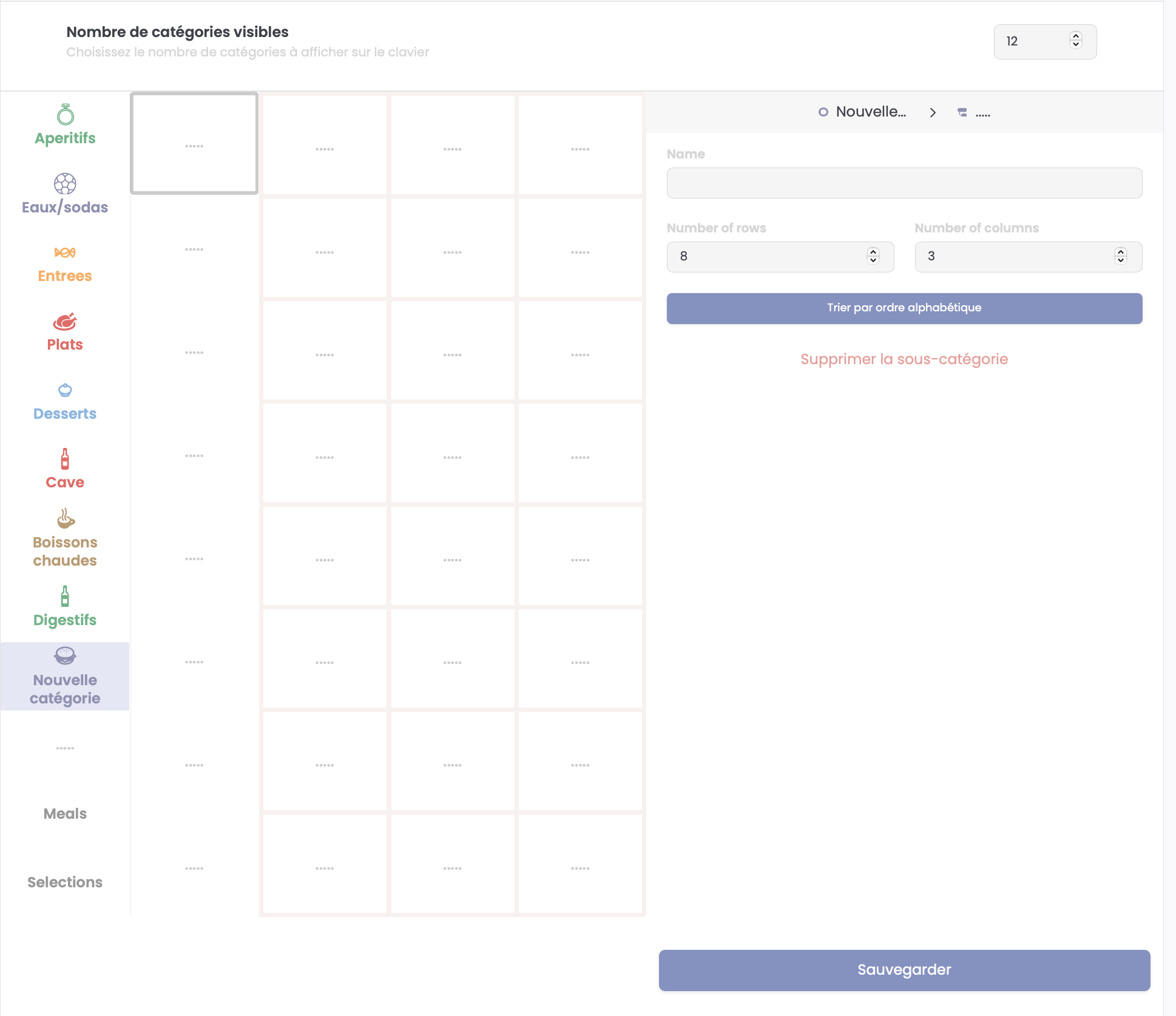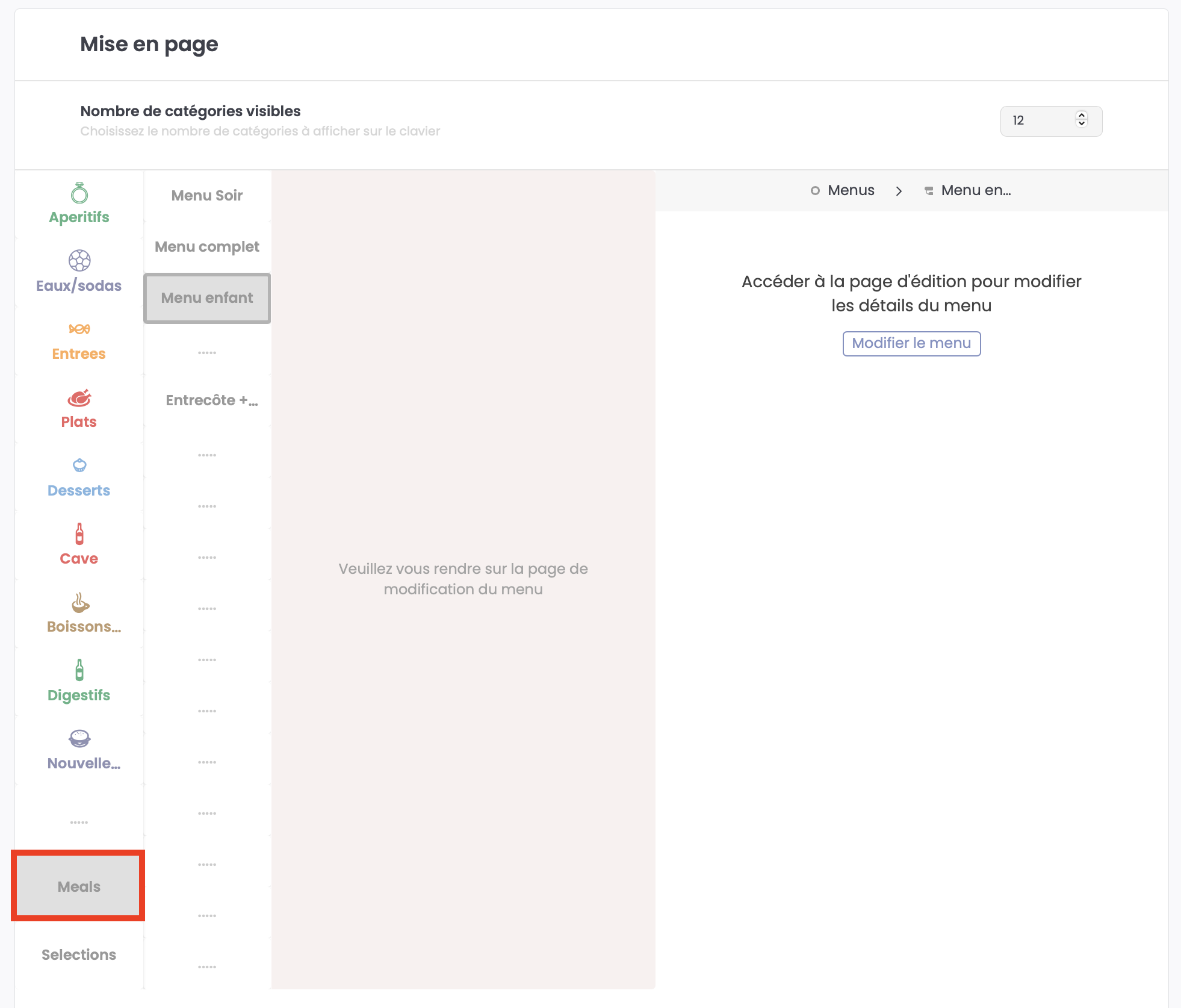 Vous pouvez définir le nombre de touches catégories que vous souhaitez afficher sur votre mise en page allant d'un minimum de 4 catégories jusqu'à 16 maximum.