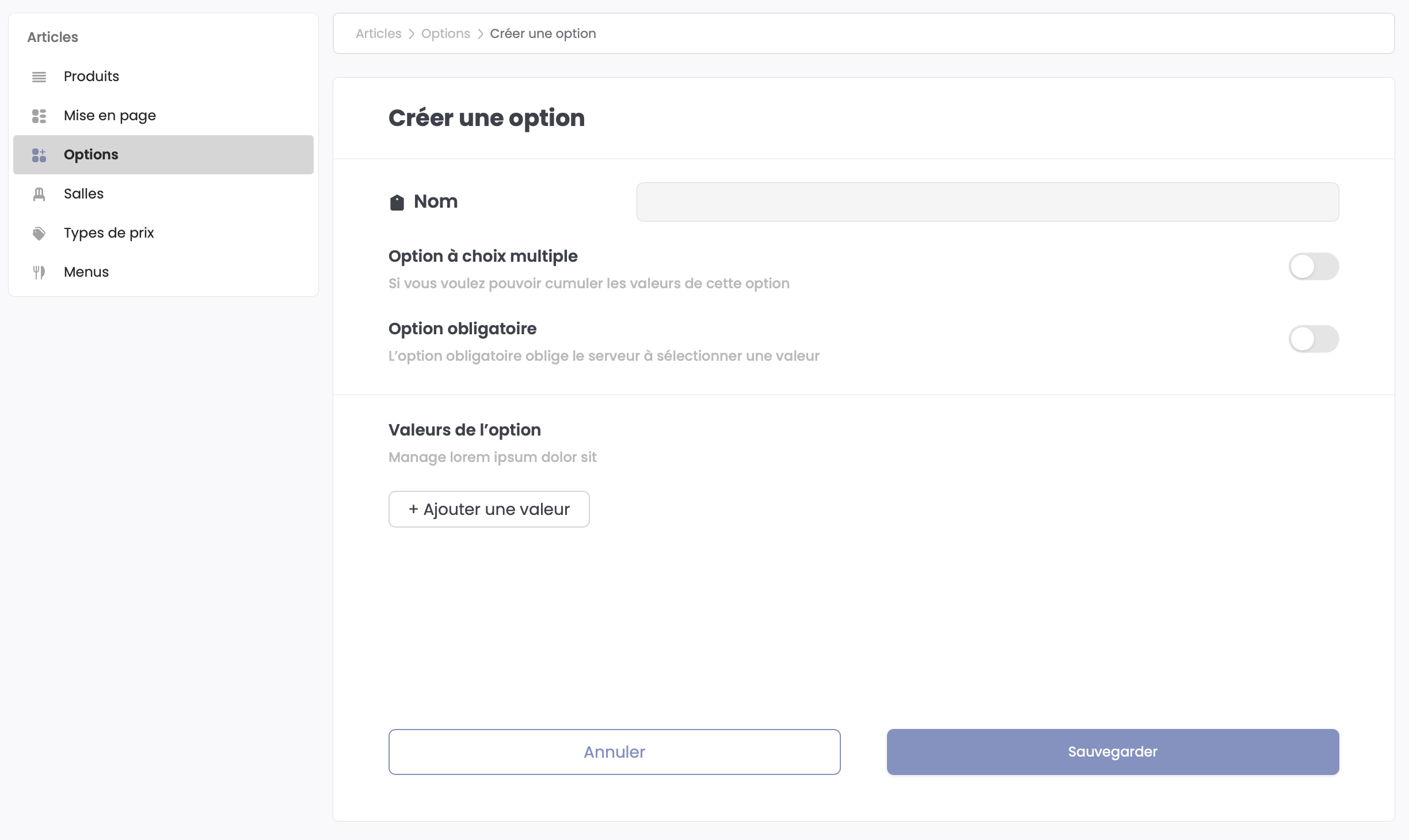 Dans la vue d’ensemble des options, cliquez sur le bouton Créer une option en haut à droite pour ouvrir le formulaire de création.
