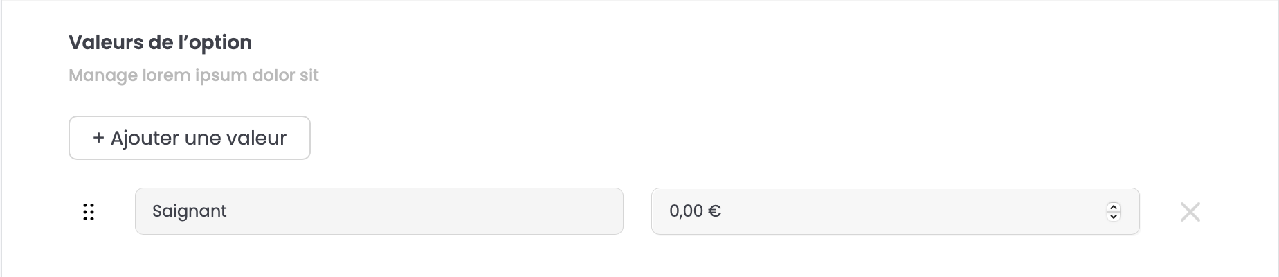 Concernant les valeurs de l'option, Sélectionnez le bouton + Ajouter une valeurpour faire apparaître un formulaire de configuration d'une valeur.