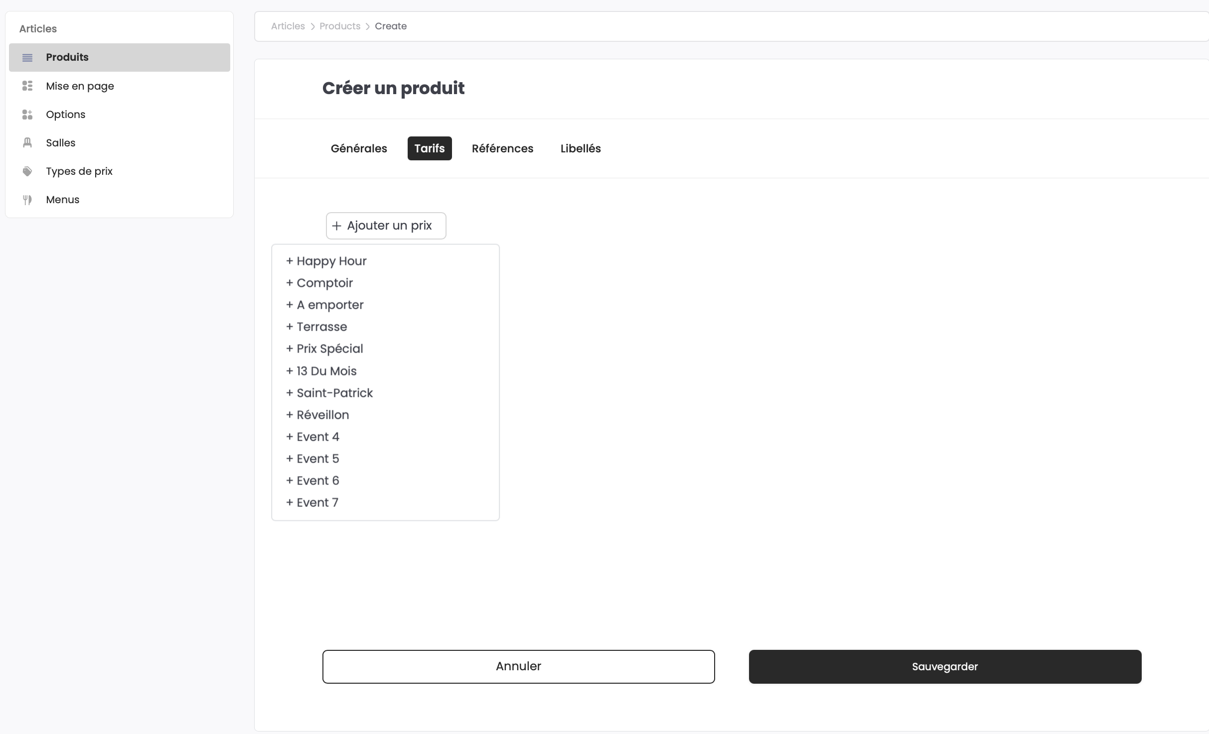 Dans la section Tarifs, vous pouvez ajouter des prix selon tout vos types de prix configurés