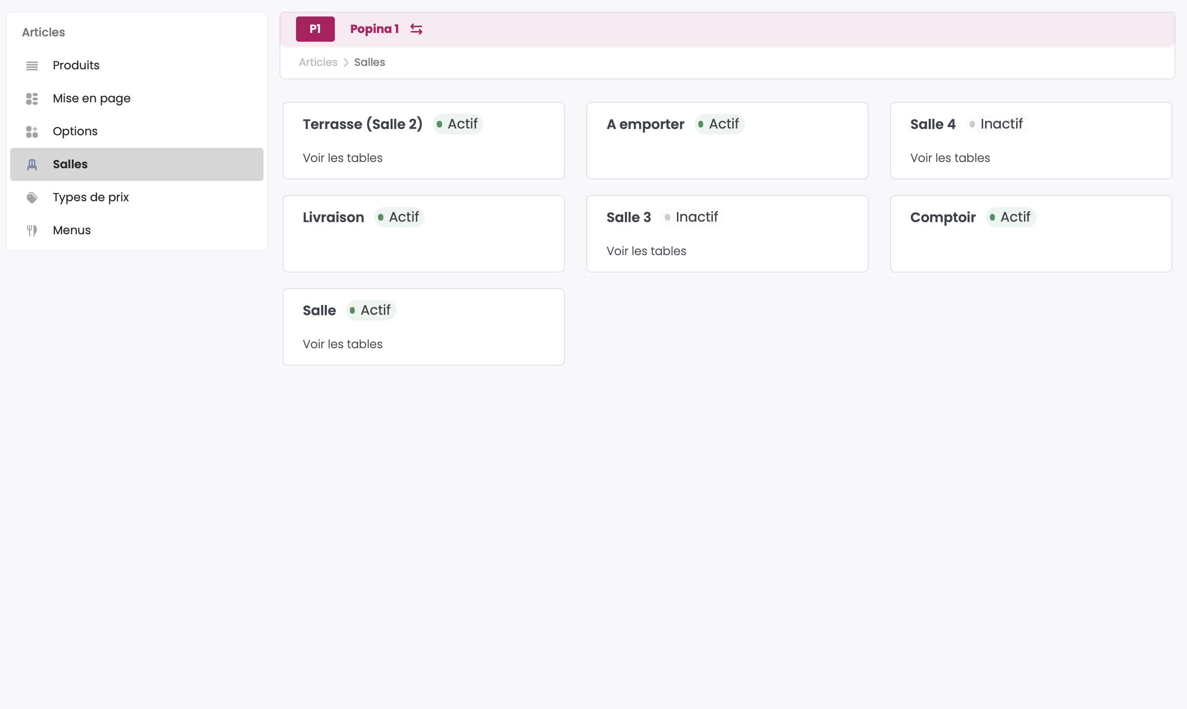 La section Salles du Back Office vous permet d'activer ou désactiver ces salles, de modifier leur nom ainsi que de configurer de nombreuses options associées.