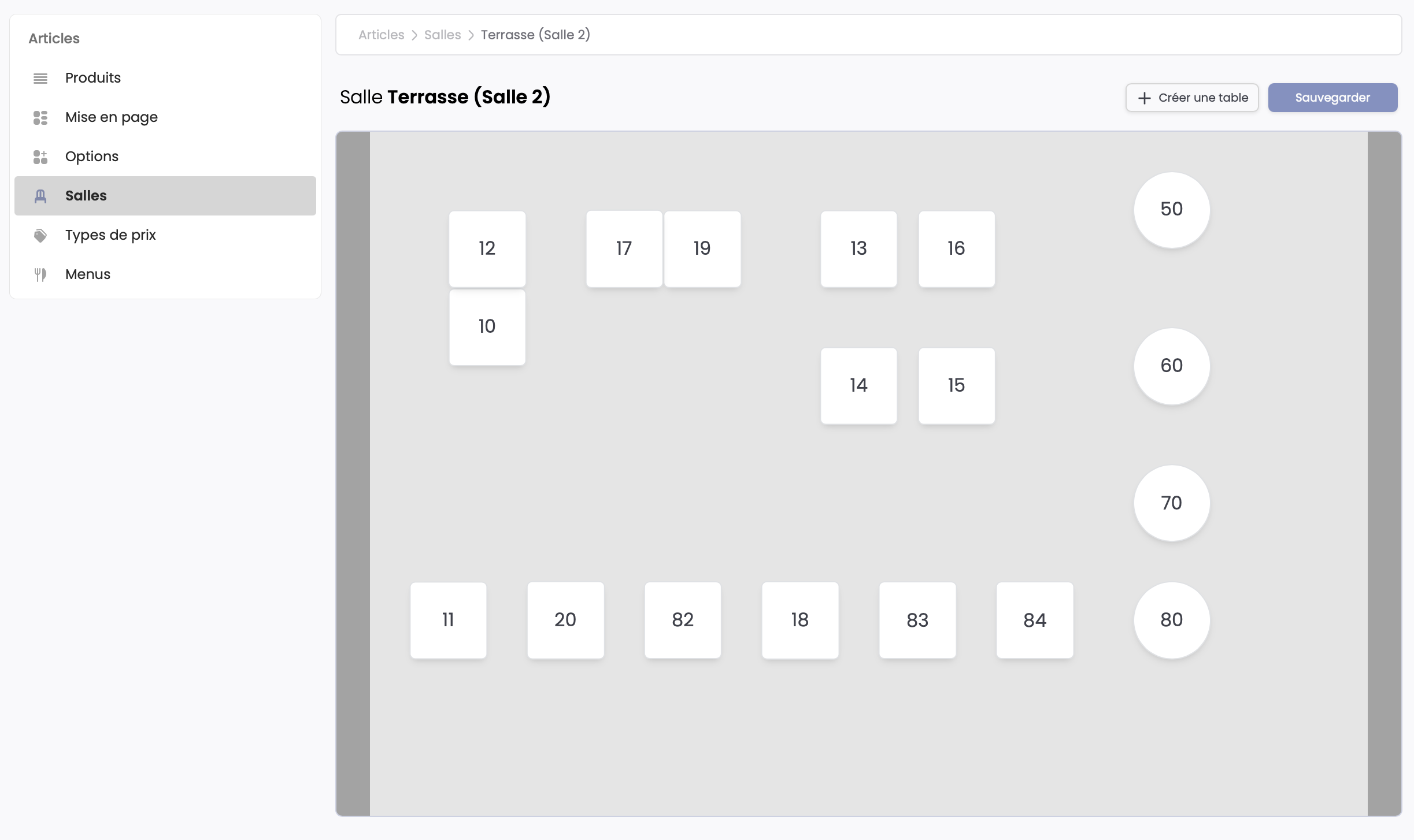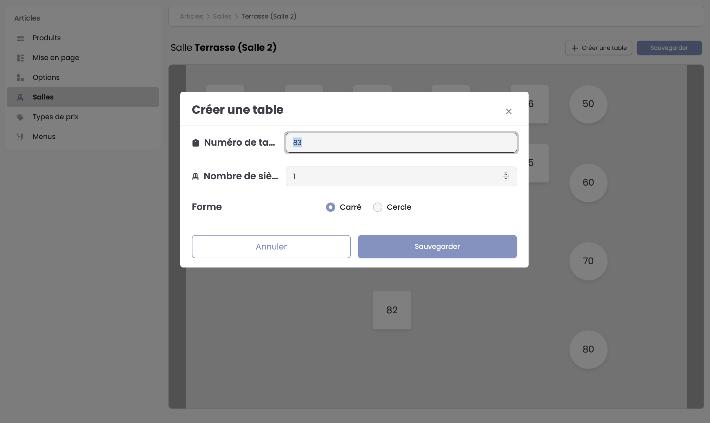 En sélectionnant le texte Voir les tables, vous accédez au plan de la salle choisie. Ici, vous pouvez réagencer votre plan de salle, créer, modifier et supprimer une ou plusieurs tables.