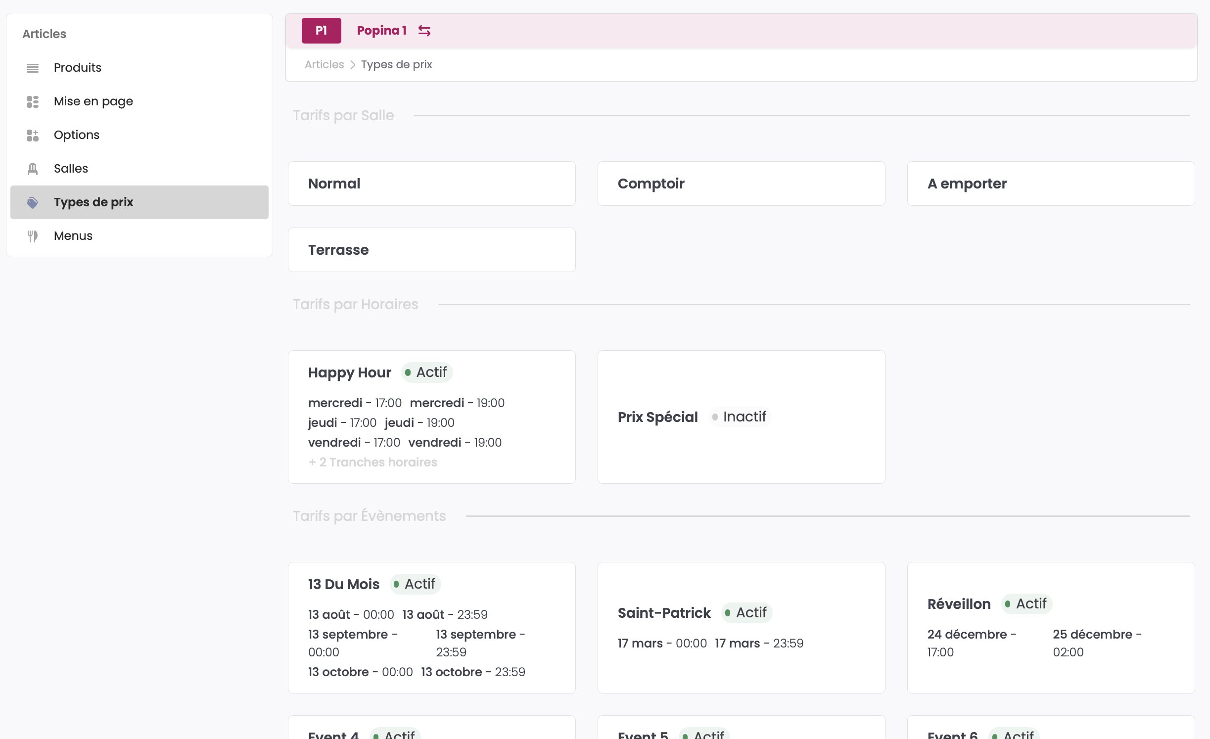 - La liste des prix (Normal, Happy Hour, prix spéciaux etc...)