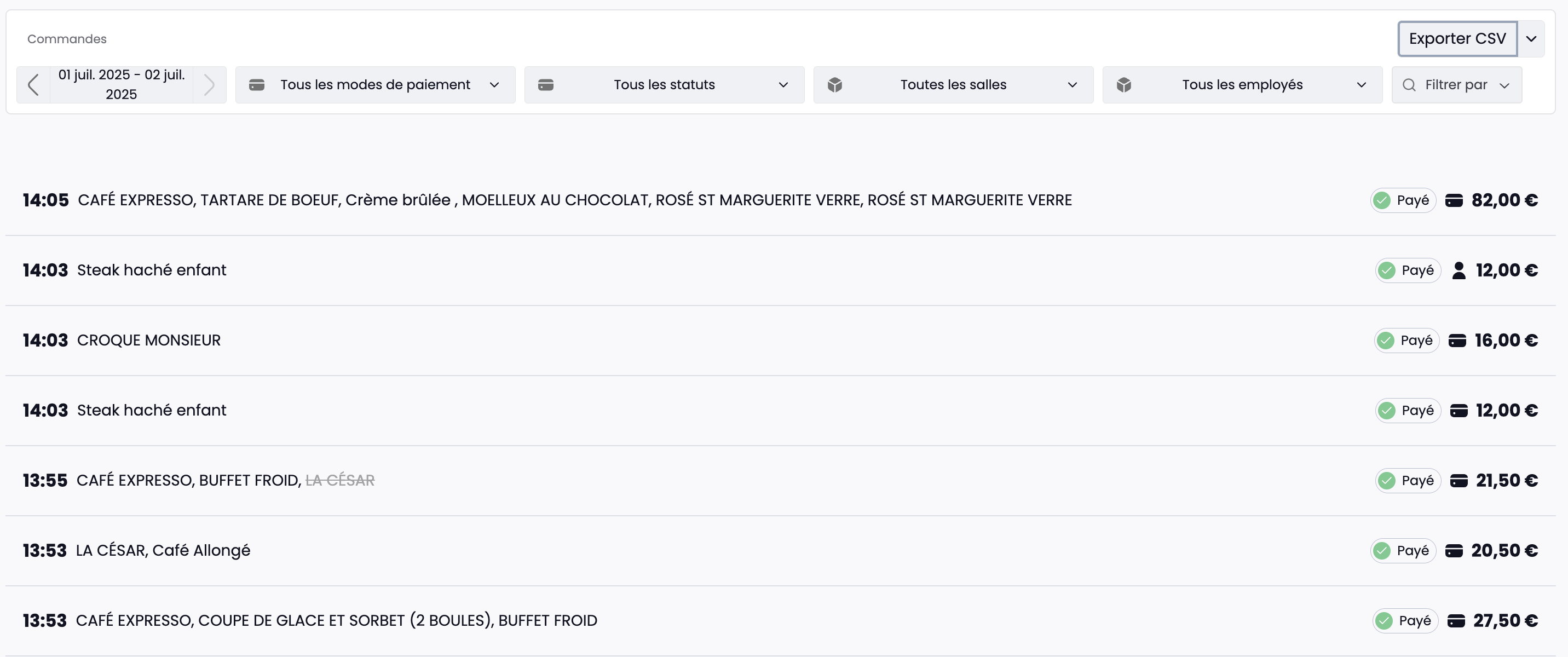 | Employé | Vous permet d’isoler les commandes prises par un ou plusieurs utilisateurs |